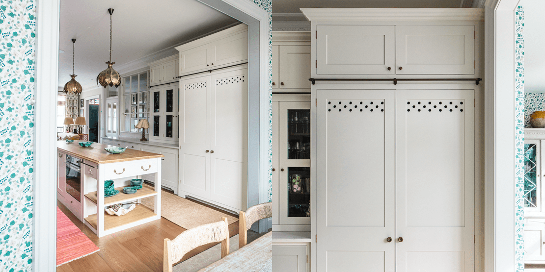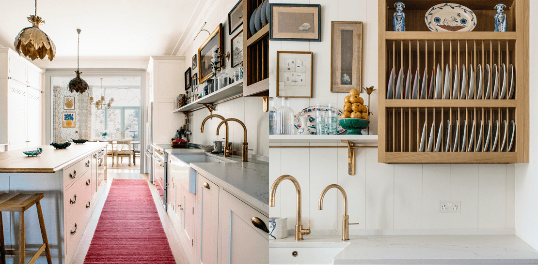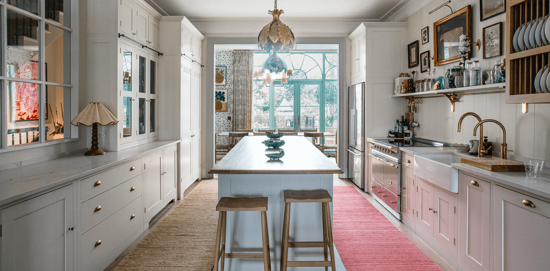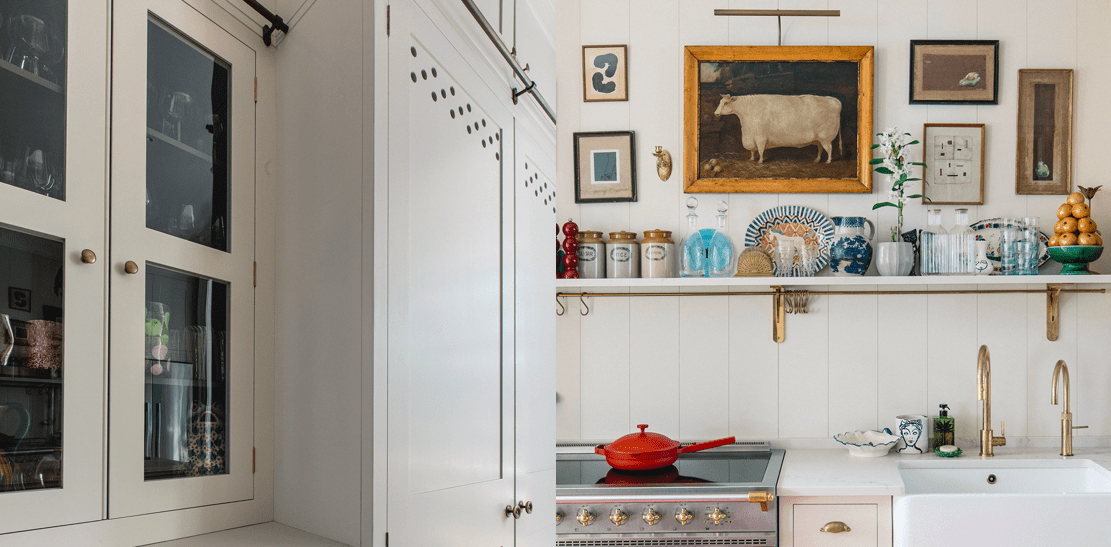 Interior designer Stella Weatherall approached the extension with care, mindful of the home’s Georgian architecture. Setting appliances in a streamlined run allows generous space for family life to unfold. Considered details add rather than detract – Marylebone holes and Georgian plinth cut-outs distinguish the ventilated areas. Warm brass finishes and a soft pink palette create a comfortable backdrop to layer art and life on top.