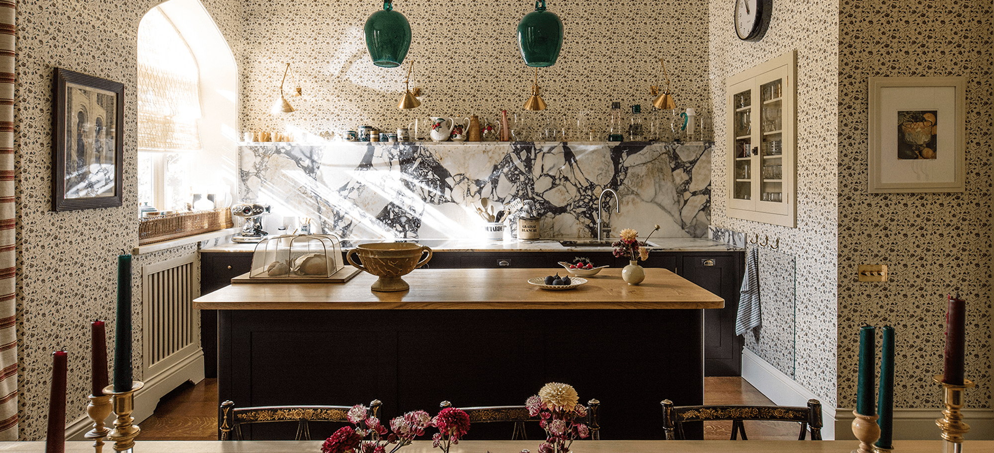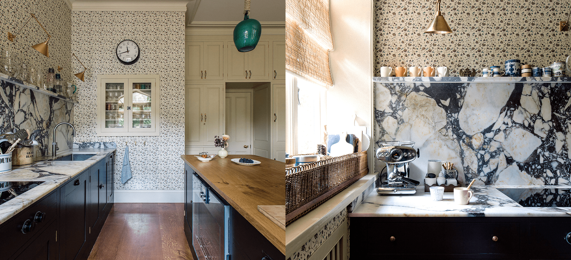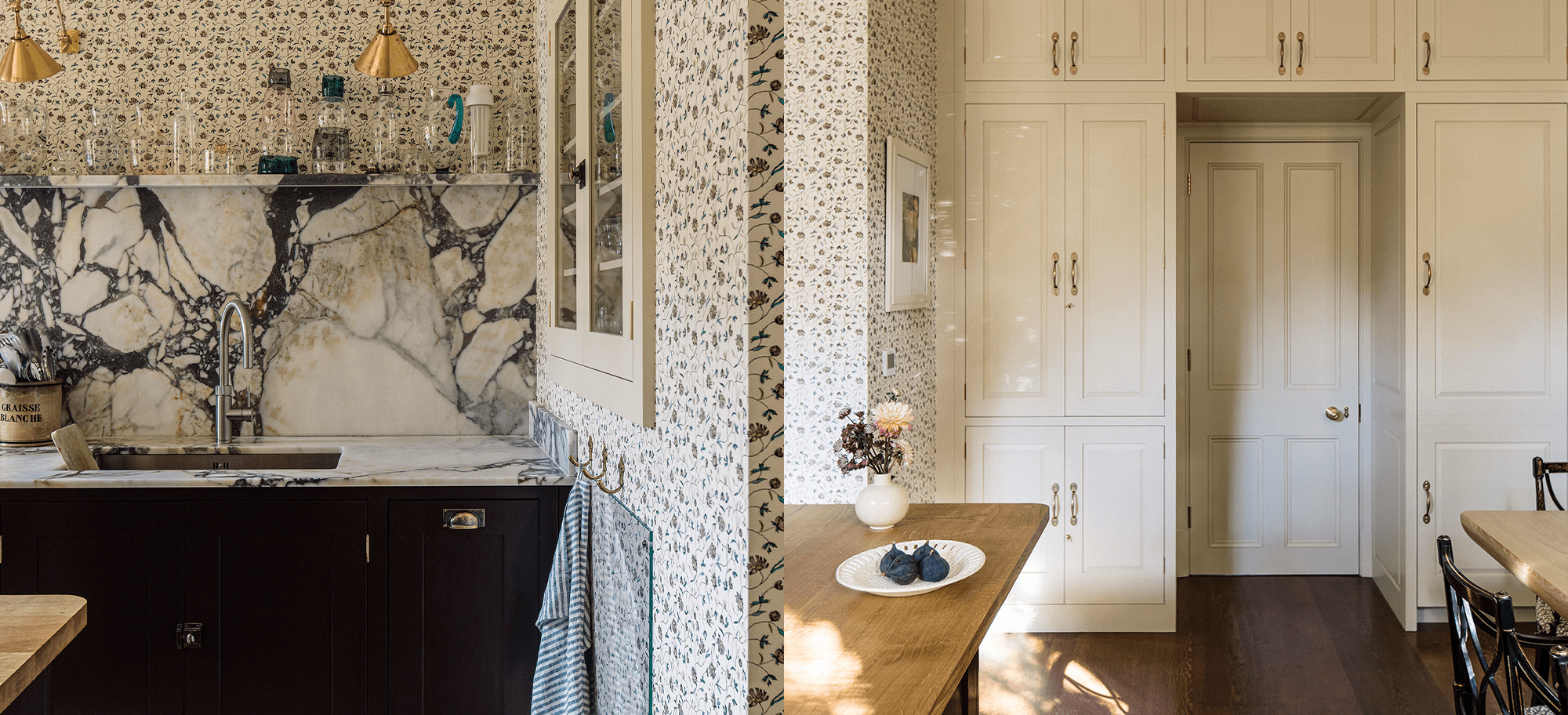 House & Garden Interior Designer of the year 2024, Rita Konig transformed her London flat into a two-story family home. The high ceilings and all-round windows create a welcoming opulence. Combining Rita’s eye for detail, her strong sense of beauty along with practical elements of living throughout. The combined kitchen and dining room offers a luxurious and welcoming space for feasting and sharing food. To one side of the room our Spitalfields cupboards, carefully hand painted in ‘Burnt Toast’ to perfectly compliment the wallpaper, nestle beneath spectacular Calacatta Viola Marble worktops and splash back. A single marble shelf invites a curated eye, with wall lamps for evening light above. Wide drawers for pots and pans sit beneath the hob, while a downdraft extractor ensures cooking smells are swiftly eliminated and maintains the open wall space above. A double sink with Quooker tap means there is no need for a kettle to add unnecessary clutter. The extra wide oven is carefully positioned out of sight within the island cupboards, where space for stools to share a morning coffee or end of day supper, tuck neatly underneath.