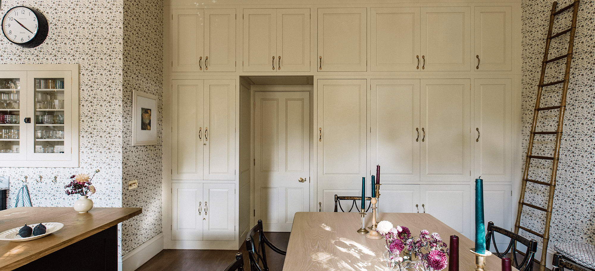 A tall run of floor to ceiling cupboards sporting elegant Hanbury doors with raised and fielded panels, hand painted in ‘Flummery’ and opened with antique brass handles and pulls, an added lock and key to the silver drawers, each lined in fabric with silken pulls. Within the tall bank, an integrated fridge and freezer are fully concealed, alongside a super wide larder with ‘U’ shaped shelving for jars and oils. The addition of a top row of cupboards accessed via a ladder to maximise out of season storage.