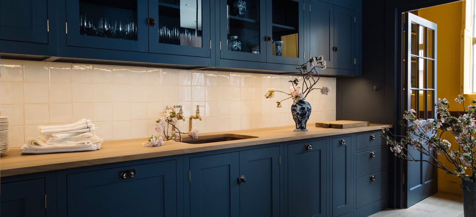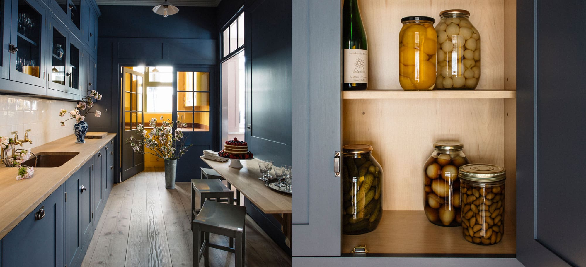LONDON BUTLERS PANTRY Elegantly proportioned, this kitchen sits handsomely with its double-height wall cupboards reflecting the Spitalfields cupboards below, with understated Wilkes doors and a honey-toned oak worktop. Hand-painted in our ‘Bib & Braces’ with a combination of glazed and solid doors, pull-out trays, an integrated dishwasher and a double recycling bin; all cleverly concealed within lacquered interiors and soft-closing drawers. A kitchen designed entirely from our Plain English Collection range of cupboards it is perfect for preparing simple suppers and lazy weekend brunches. Photos of maple interiors are shown here, our Plain English Collection cupboard interiors are now oak.