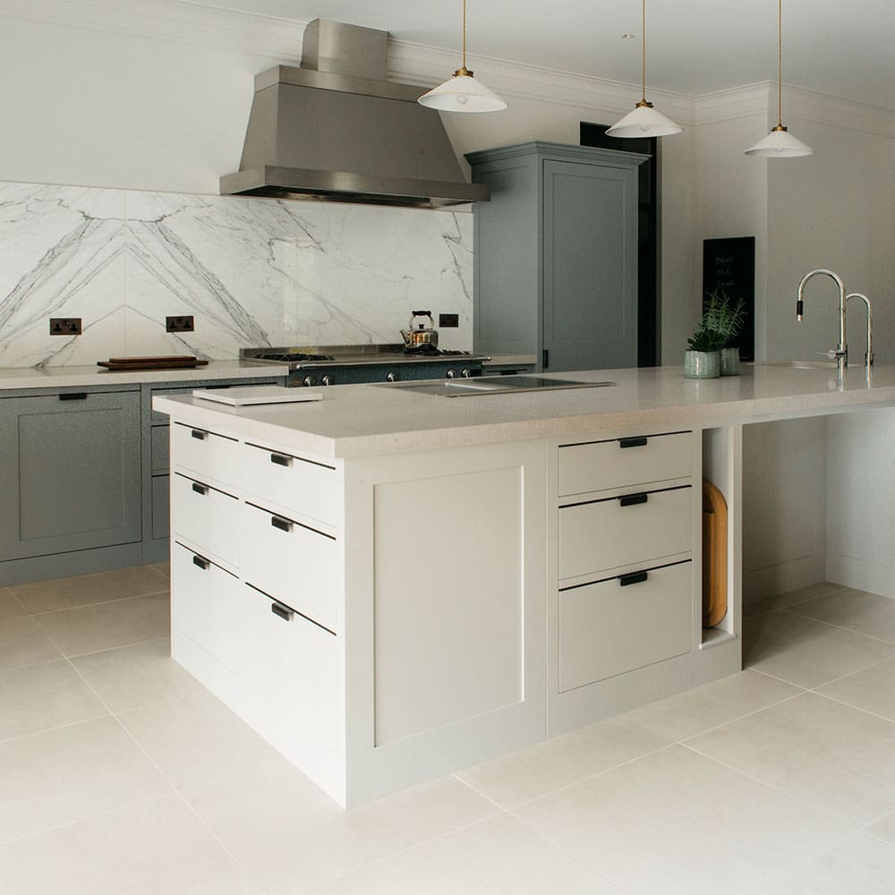 This monochromatic scheme has been extruded from a marble-clad niche in this historic home. An industrial sliding shelf system minimises clutter. In the main space, a generous run of Osea cupboards topped with elegant open shelving creates a natural flow to the living space. The rawness of the scheme is softened with glinting gold accessories.
