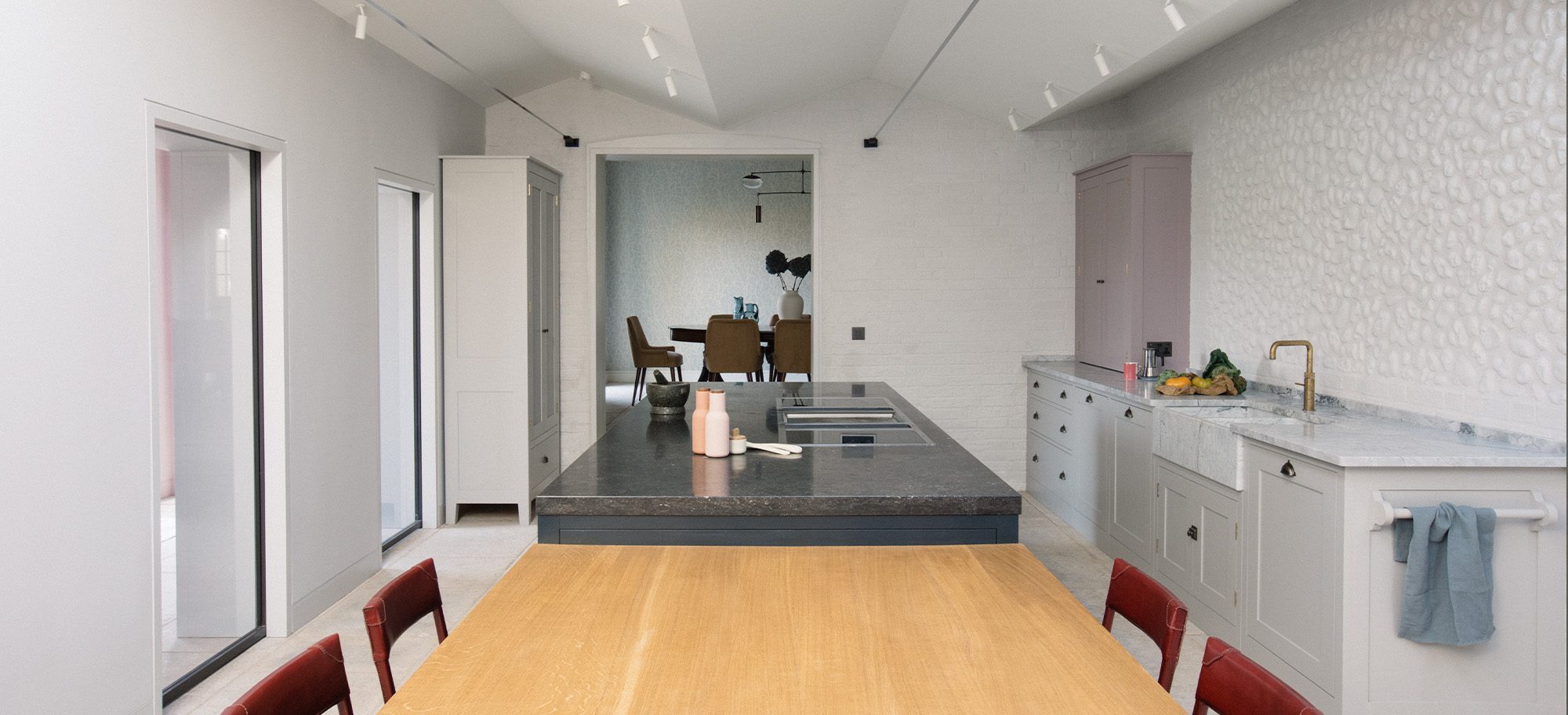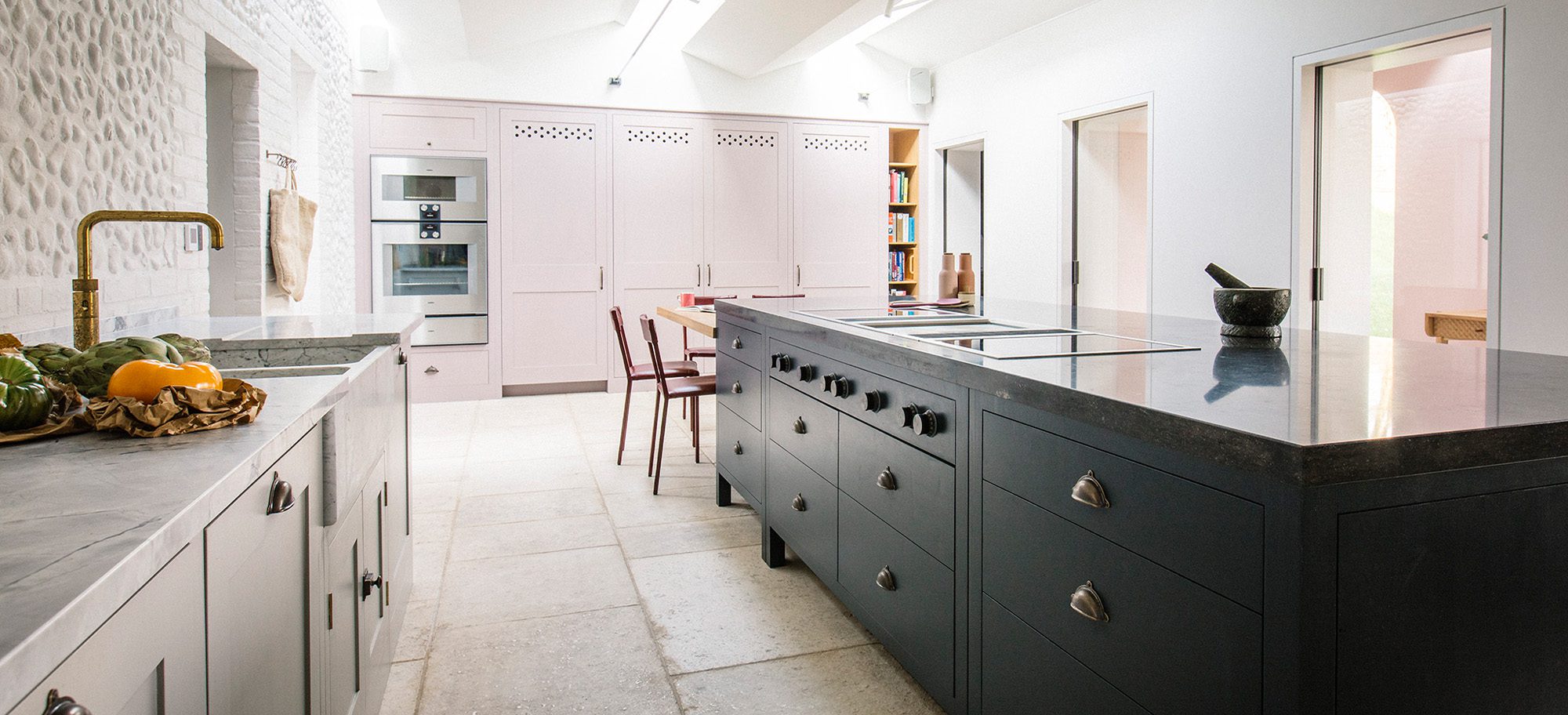 A family home in the heart of the Norfolk countryside; extended over time and combining both Georgian and Victorian architecture alongside a sympathetically designed side extension, this house embraces the Norfolk flint exterior wall to create a distinctive spacious kitchen and walk-in pantry. The home of a passionate cook, a downdraft extractor was an essential element of the design, which was incorporated into our Osea Island, centrally placed and ducted for efficiency to the outside. Generously proportioned pan-drawers below and to each side of the hobs, are well positioned for pans, serving dishes and utensils. An oak-topped table is included within the island design, an ideal spot for casual suppers and morning coffee.
