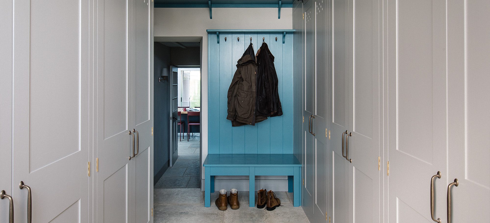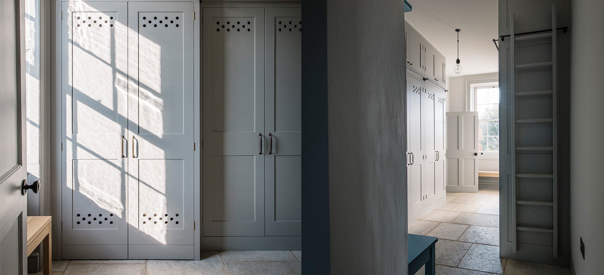 The adjacent bootroom welcomes as you enter the rear of the house, with a bench seat for pulling muddy boots on or off and coat pegs above. There is also ample room for dogs and their beds, plentiful cupboard space for coats, pull-out trays for shoes and a cupboard for summer games paraphernalia. A top row of cupboards is accessed by a ladder and rail, perfect for out of season storage.