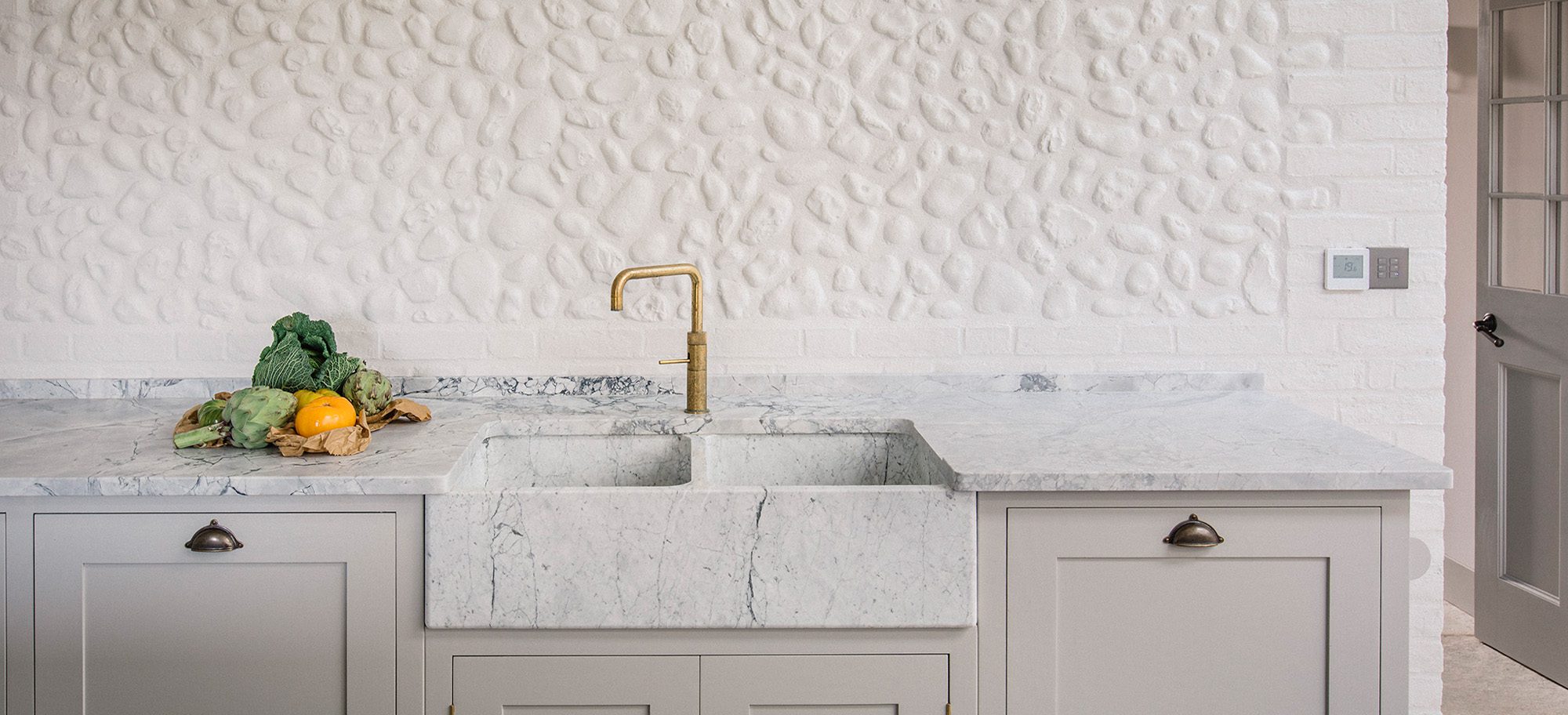 A double marble sink sits within the Bianca Eclipsia worktop, the greying tones perfectly complementing the limewashed flint wall behind, punctuated only with a single counter standing cupboard painted in ‘Mouldy Plum’ and accented with tourmaline cup handles and cupboard latches.