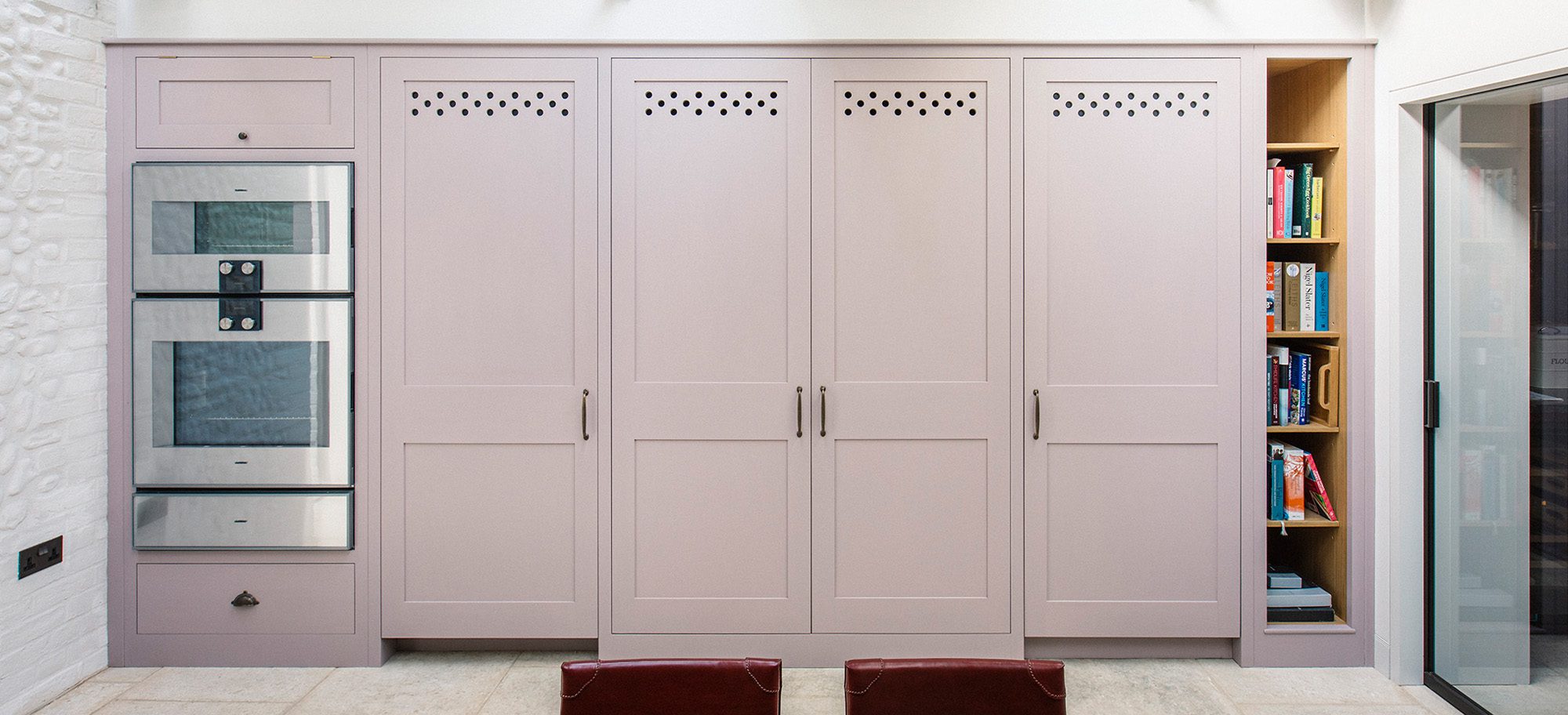 In a highly organised fashion, a tall run of our Spitalfields cupboards, hand painted in the same ‘Mouldy Plum’, houses the ovens, warming drawer, integrated fridge and freezer as well as cleverly concealing a television. To the side, a walk-in pantry provides a separate space for coffee making and mixing and serving drinks with pull-out oak trays below for essential snack storage.