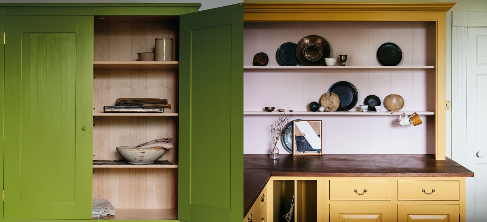 Stowupland Hall is a grand Georgian farmhouse, and this Plain English kitchen was inspired by the formality of its 18th-century dining room. The period details are enhanced by Spitalfields floor cupboards, which have been fitted with ‘raised and fielded’ panels, and painted in “Plain English Nicotine” with the dresser internals in “Silver Polish”. The ample drawers have Georgian drop handles and Quirk detail. Kitchen clutter is hidden behind three-panel doors in the Fournier counter-standing cupboards. Rich Iroko worktops offset the pale scheme whilst, in the centre of the room, the pared-back worktable, painted in “Plain English Burnt Toast”, has a lustrous English Blue Black Slate surface.