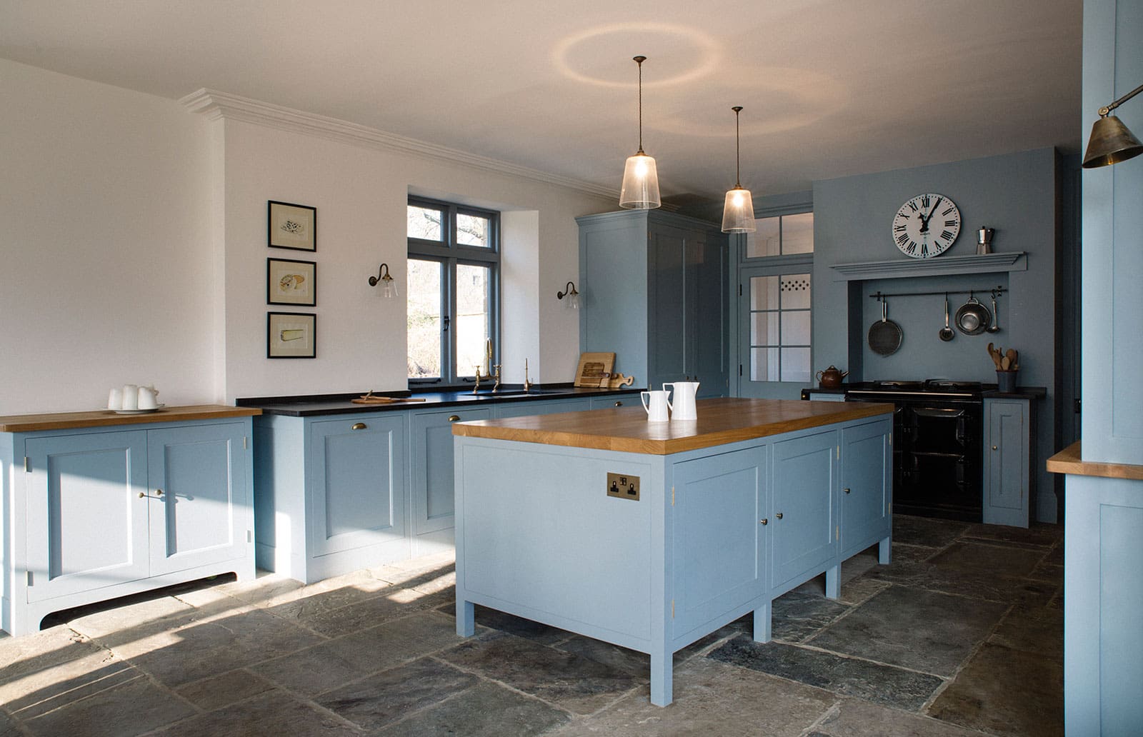 The engine room of a great country house is evoked in this elegant, bone-china blue design. On one wall, two counter-standing Spitalfields cupboards with Folgate doors are conjoined by a Georgian-style cornice, giving the appearance of a generations-old dresser. These proportions are echoed on the opposite wall in the design of the built-in, full-height fridge. The Osea Island, topped in Euro Oak, is a place for industry, as is the honed Diresco Belgian Blue Velvet worktop.