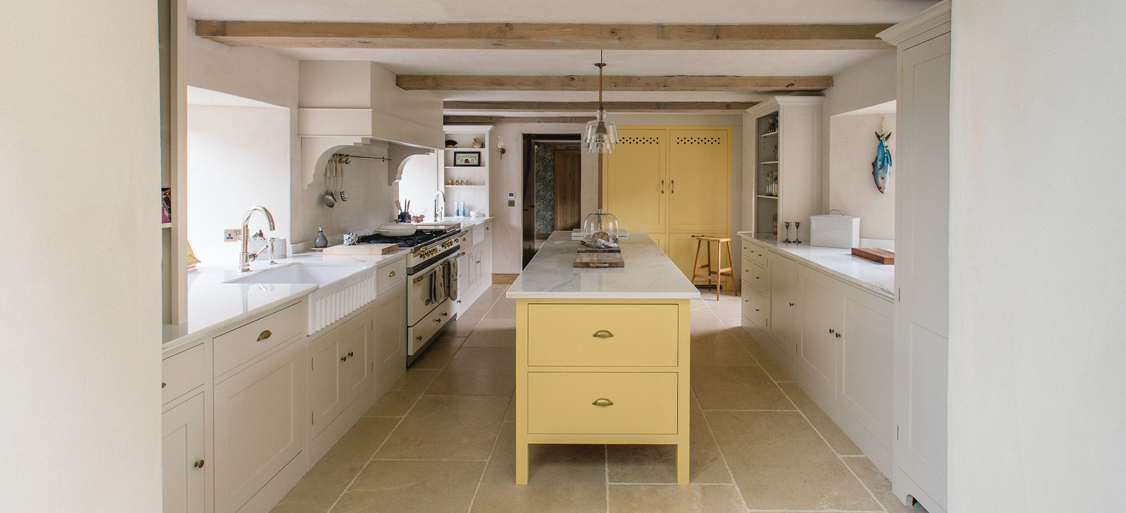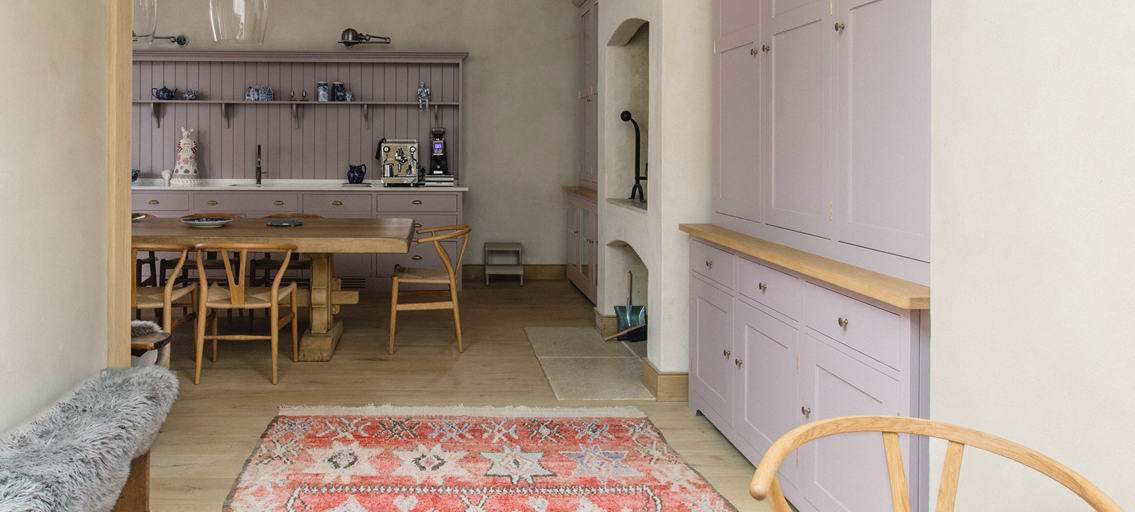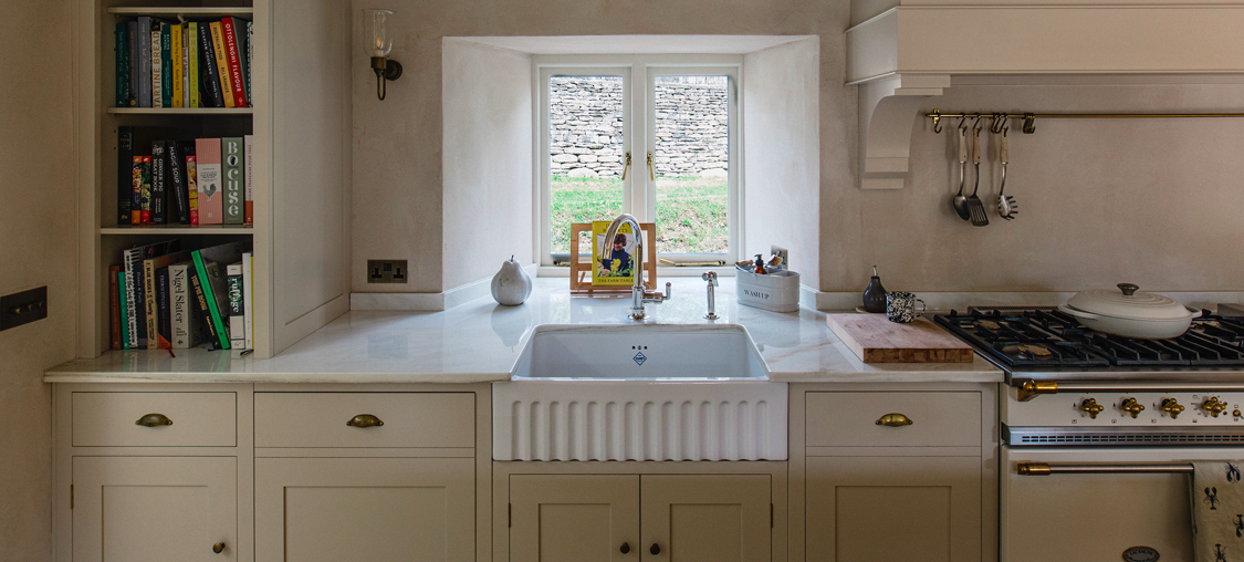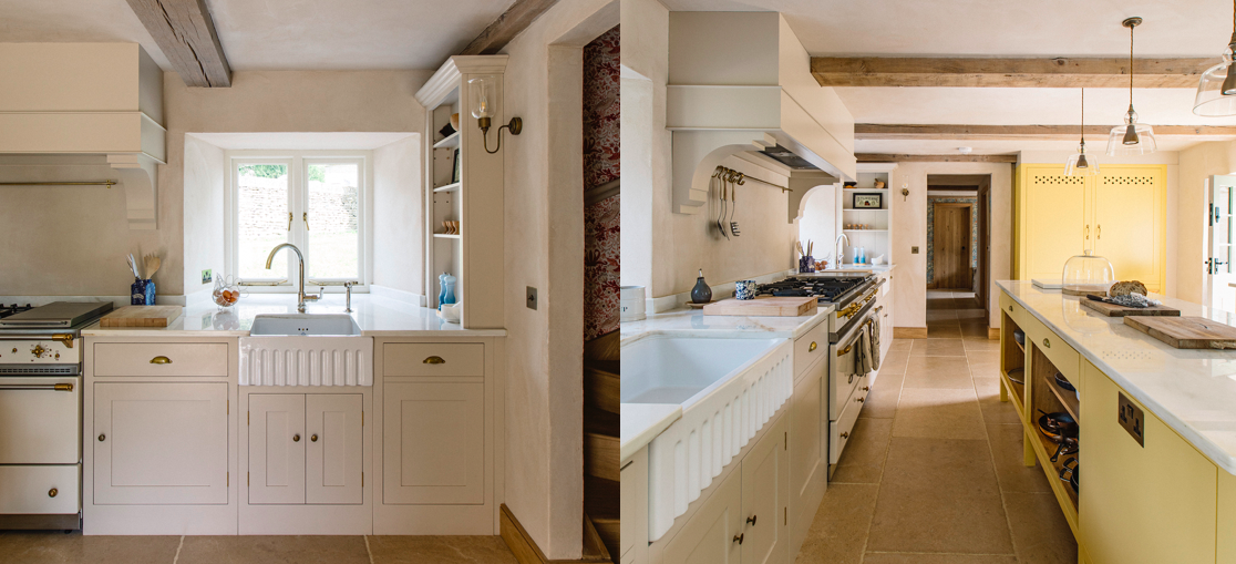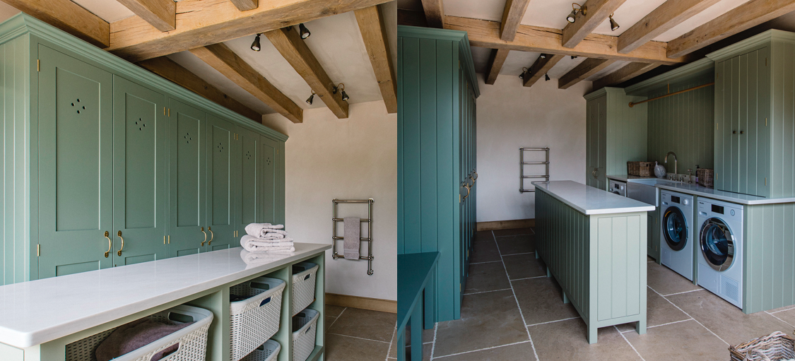 Digging down into the adjacent hillside offered a new, dramatically vaulted interior dining space. A run of Spitalfields cupboards creates a long dresser for breakfast essentials, including a concealed beverage fridge and coffee bar. The adjacent kitchen leaned on French country influences, evident in the design of the central chimney. Plentiful drawers and cupboards below ensure bountiful storage is at hand, while counterstanding open shelves above are suited for accessible glassware and cookbooks. The boot and laundry room is a hardwearing, welcoming place to kick off muddy Wellies and hang coats before coming inside.