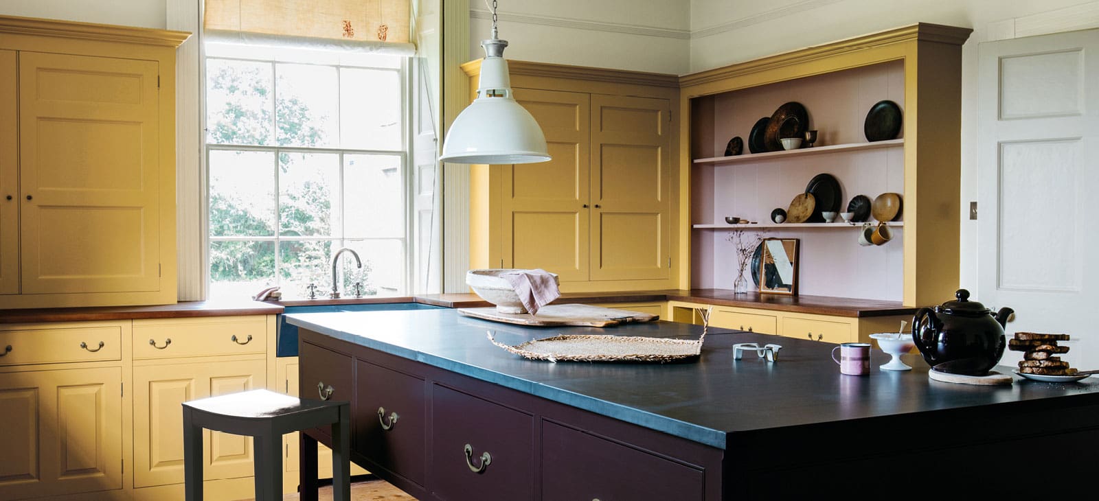 Stowupland Hall is a grand Georgian farmhouse, and this Plain English kitchen was inspired by the formality of its 18th-century dining room. The period details are enhanced by Spitalfields floor cupboards, which have been fitted with ‘raised and fielded’ panels, and painted in “Plain English Nicotine” with the dresser internals in “Silver Polish”. The ample drawers have Georgian drop handles and Quirk detail. Kitchen clutter is hidden behind three-panel doors in the Fournier counter-standing cupboards. Rich Iroko worktops offset the pale scheme whilst, in the centre of the room, the pared-back worktable, painted in “Plain English Burnt Toast”, has a lustrous English Blue Black Slate surface.